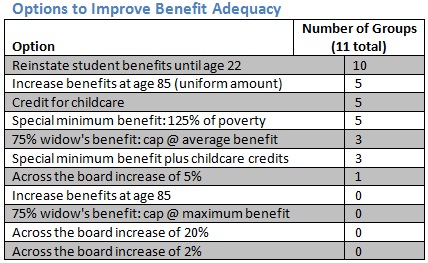 The adequacy of Social Security’s benefits was discussed because benefit amounts are modest, and much of America’s aging population, as well as many disabled workers, rely on Social Security’s benefits. That reliance has intensified since the beginning of the recession in late 2007. Compounding this problem, the modest benefits have not kept up with rising health care and housing costs faced by many Americans. Perhaps due to this gap, ten of the eleven groups supported at least one of the options to increase the adequacy of benefits. The groups tended to support adequacy options that increase benefits for vulnerable groups including children, the poor, and the oldest of the old. These populations were targeted through the following most popular options: