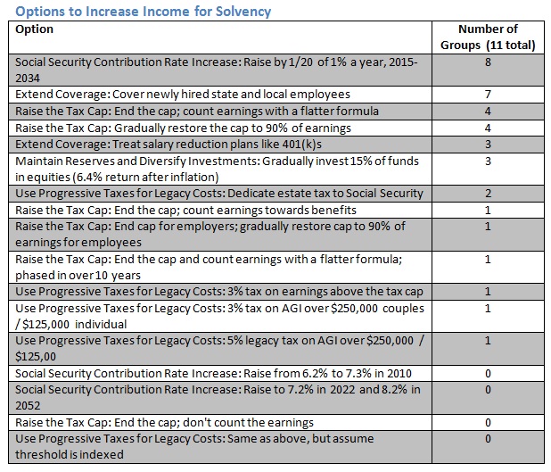 Since its beginning, Social Security has been financed as a “pay as you go” system, which means that current contributions of current workers fund the benefits of current retirees. As the baby boomer generation ages, the number of workers per beneficiary falls, which has led many to question the future financing of the program. To address the issue of solvency, the following four policy options were chosen by the NASI Summer 2012 Academy participants: