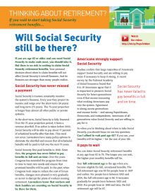 The fact sheet is based on the brief, When Should I Take Social Security Benefits? Questions to Consider and the video Social Security: It Pays to Wait. It summarizes the Social Security program’s finances and dispels misinformation about the system’s future.